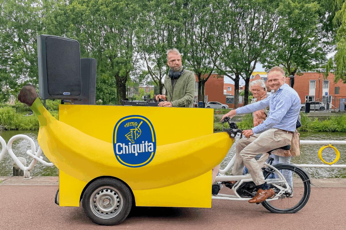 “Hoor je dat?” ‘Wat?’ “Ik hoor iets van muziek!” ‘Hé nou hoor ik het ook!” en jawel wat zien ze daar aankomen in de verte? De volledig mobiele DJ-bakfiets natuurlijk!